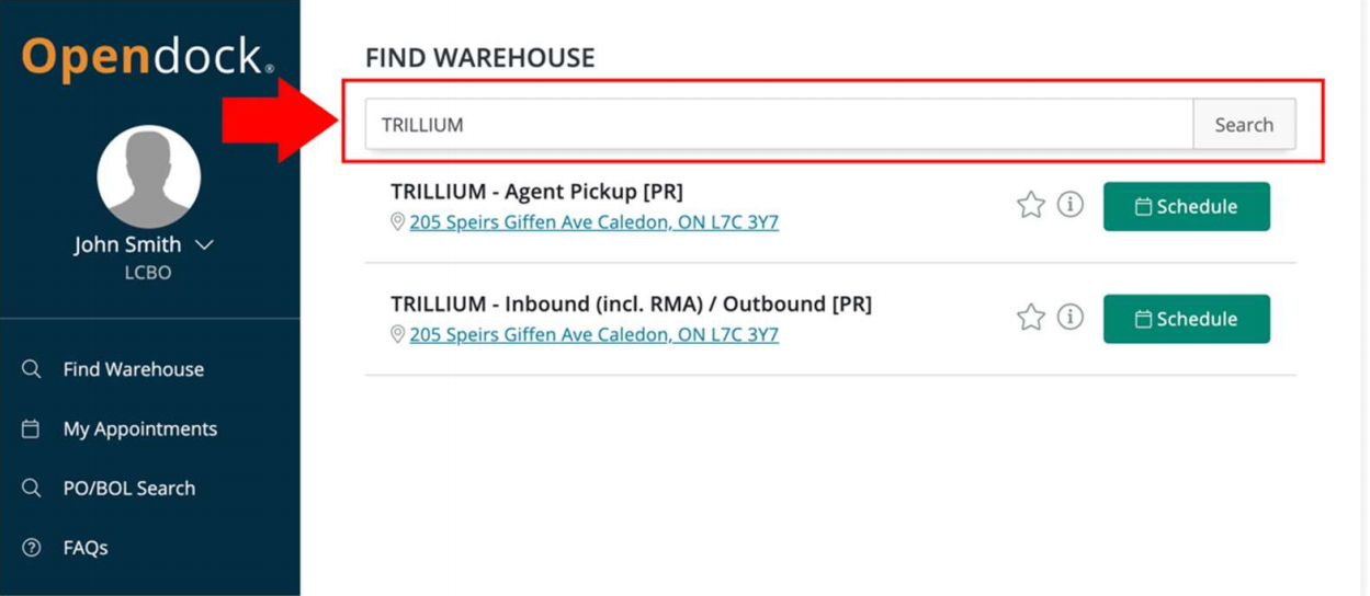 1. From the Opendock main portal page, type “TRILLIUM” under the Find Warehouse header and then click Search.